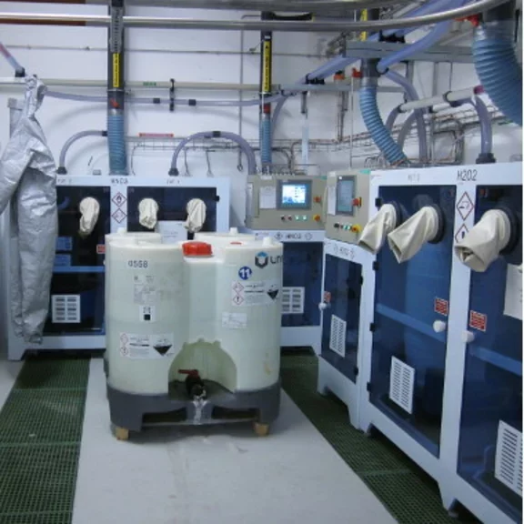 The chemical fluids can come from different sizes of incoming: 200-liter drums, 1,000-liters totes, up to ISO tank container.