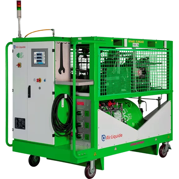 Air Liquide's gas to gas mobile unit for vaporization equipment is a fully automatic and mobile solution on a cart with an integrated 530L gas mixtures storage tank for conducting factory or laboratory tests (tightness, dielectrics, etc.) on gas insulted equipment.